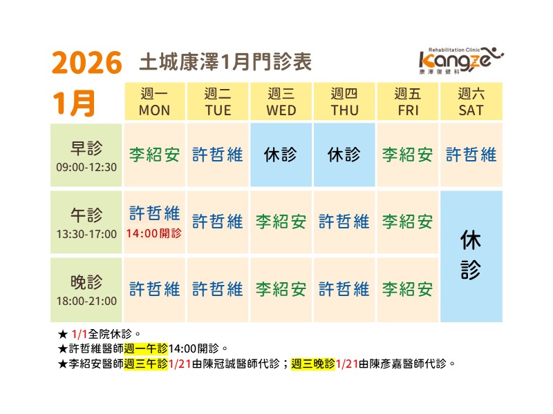 make an appointment 提醒您! 初診不適用網路掛號 歡迎致電預約掛號 ◆(02) 7728-7912 預約/查詢/取消掛號 看診進度查詢 複診即可線上掛號歡迎直接點選LINE加入好友並綁定手機號碼 土城康澤復健科診所 NEILI DISTRICT 236新北市土城區中央路二段304號 02 7728 7912 追蹤土城康澤 facebook 門診表 OUTPATIENT SCHEDULE